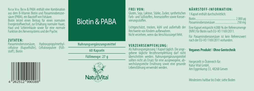 Natur Vital Biotin & PABA enthält eine Kombination aus dem B-Vitamin Biotin und Paraaminobenzoesäure (PABA), ein Baustoff von Folsäure. Biotin leistet einen Beitrag für einen normalen Energiestoffwechsel, zur Erhaltung normaler Haare, Haut und Schleimhäute sowie für eine normale Funktion des Nervensystems und der Psyche.